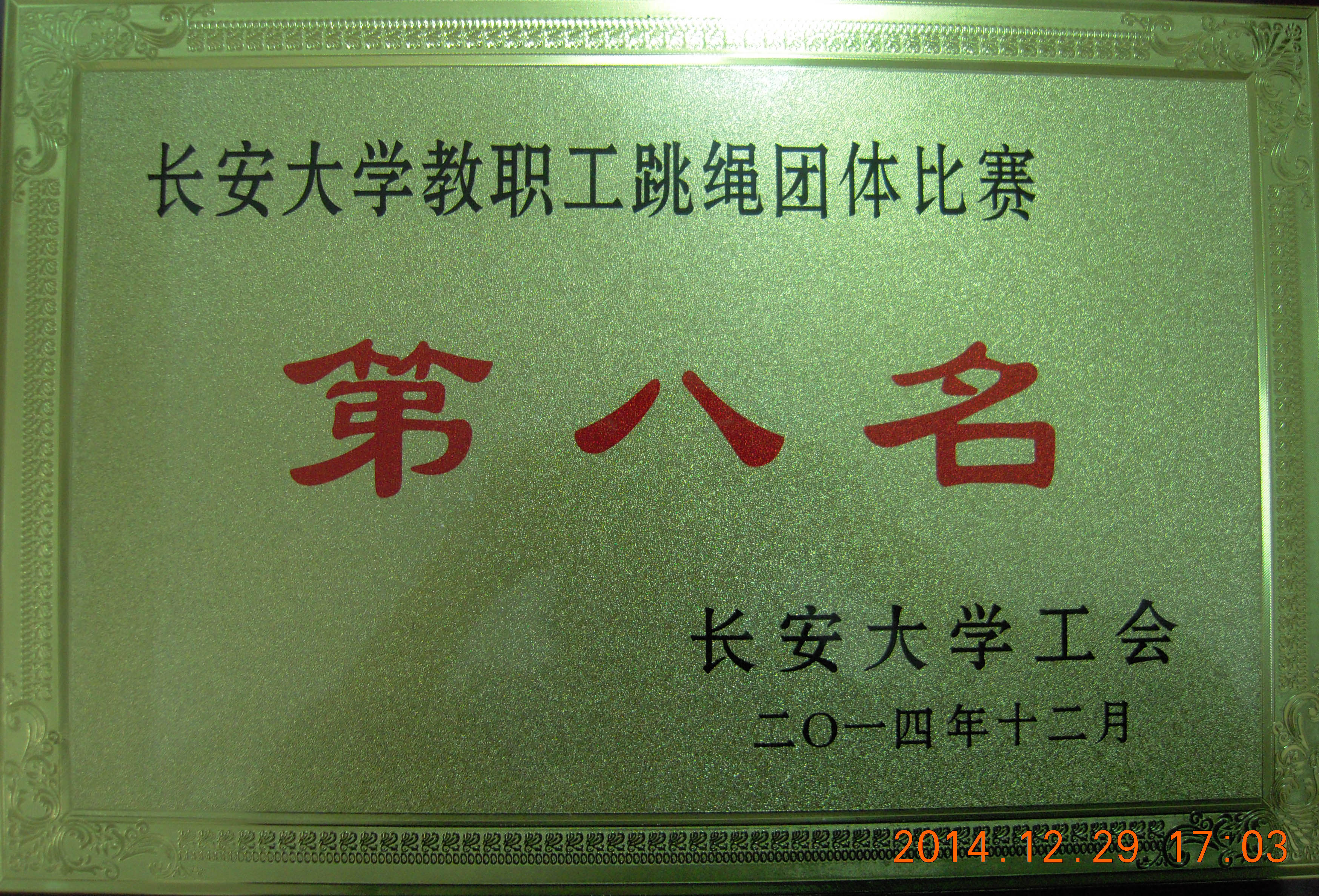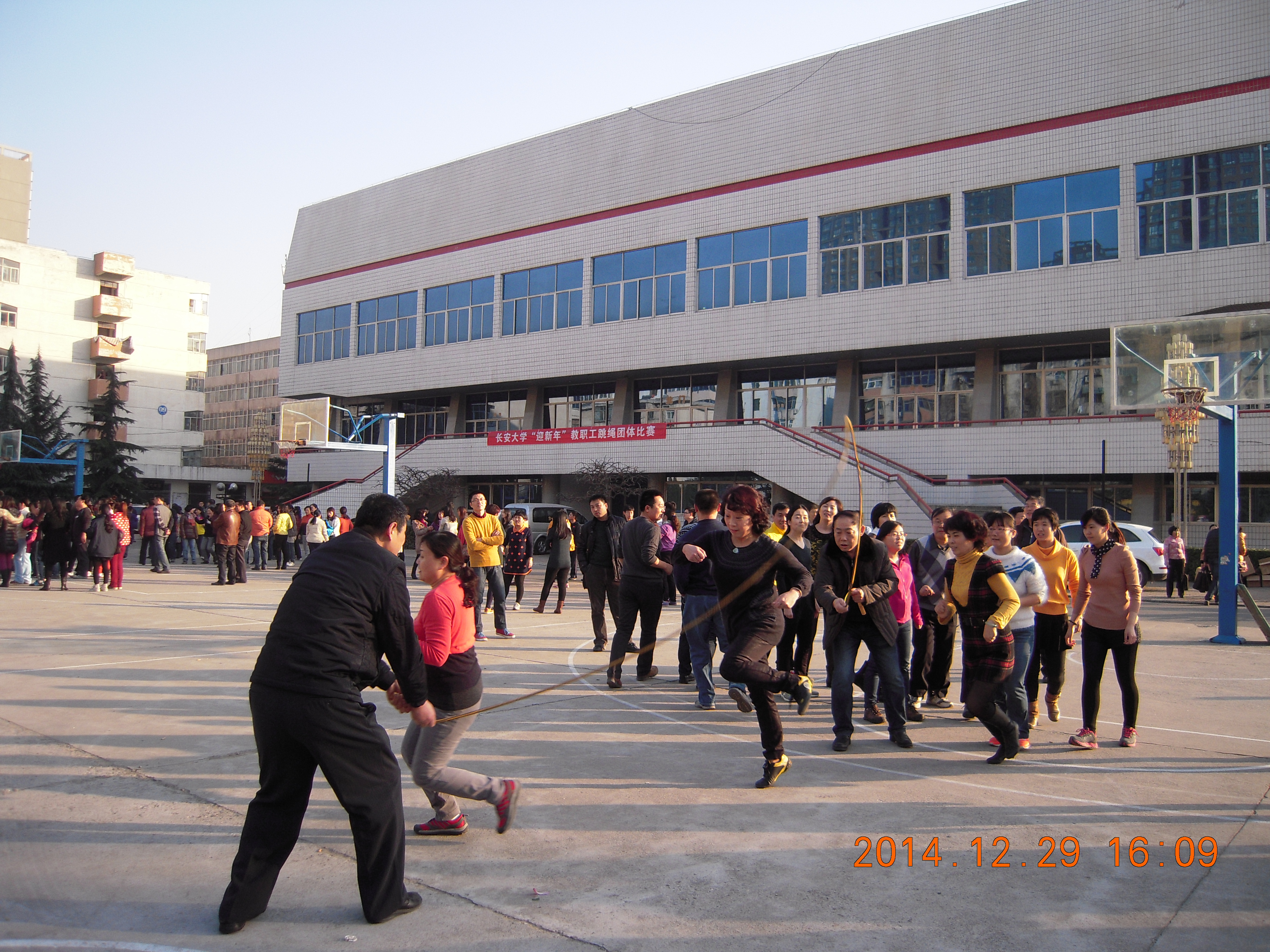 2014年12月29日下午四点,在校本部北院体育馆北侧篮球场举行了长安大学“迎新年”教职工跳绳团体比赛。我院教师积极参与,16人循环2分钟计时跳154次,总成绩名列第八名。