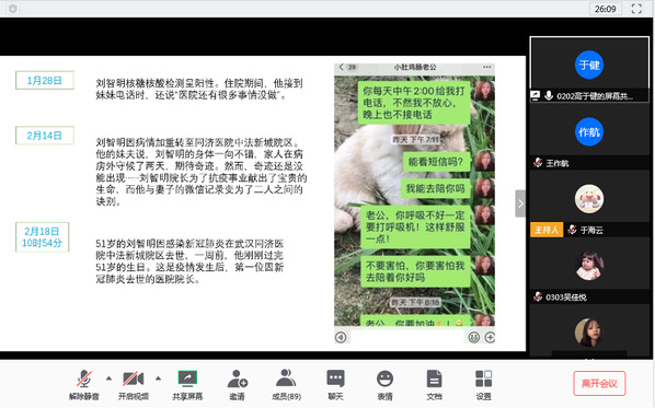 其他同学还讲述了刘智明等英雄的事迹和大学生郭岳的抗疫经历。王作航老师对同学们的分享表示感谢,呼吁大家铭记历史,致敬英雄,缅怀在疫情中牺牲的烈士和逝世同胞,从英雄事迹中激发内心爱党爱国的热情,珍惜韶华,努力拼搏。
