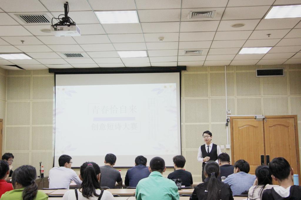 2019年5月23日晚7点,由共青团长安大学委员会主办、经管学院承办的“青春恰自来”第三届长安大学创意短诗大赛决赛在大学生活动中心二楼顺利举办。担任本次大赛的评委有长安大学学生社区管理中心主任陈伟、长安大学团委副书记赵丹、经管学院党委副书记吴喜梅、地测学院团委书记邵龙、经管学院团委书记徐永超。十位参赛选手及其亲友团悉数到场。