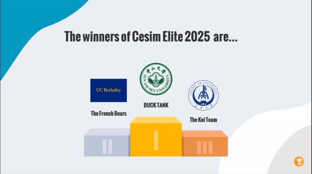本届比赛于2025年5月26日至6月2日举行,采用线上形式进行。长安⼤学The KOI Team本科⽣队在模拟经营环节和案例分析环节展现了精准的市场判断和投资策略,获得评委的高度认可。最终,我校本科生队击败多⽀MBA和研究⽣队伍,斩获全球总决赛季军。这一成绩是我校在此项赛事的历史最佳成绩,我校The KOI Team本科⽣队也成为赛事历史上第5支入选Cesim Elite全球商业模拟⼤赛名⼈堂的本科⽣队伍!