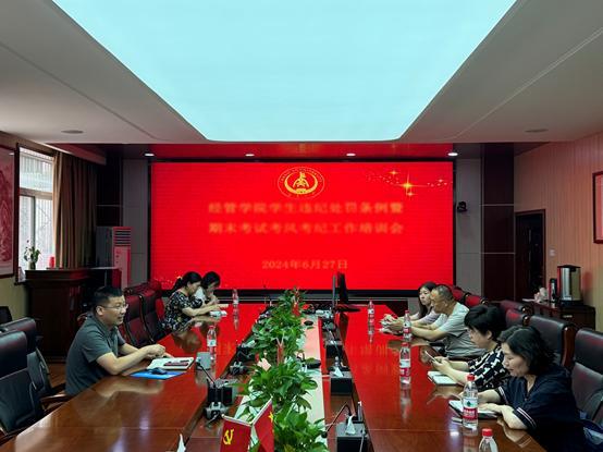为扎实推进学院学风建设,深入开展考风考纪教育,增强全院师生规矩意识,6月27日下午,经济与管理学院于学院一楼会议室召开期末考试考风考纪工作培训会,学院副院长白礼彪、各系(室)教师代表、辅导员代表参加会议。会议由学院副院长白礼彪主持。