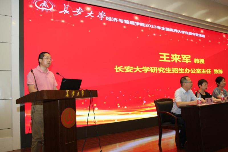 首先,长安大学研究生招生办公室主任王来军教授致辞。王主任对来自全国各地的203名优秀学子表示热烈欢迎,对辛勤筹备夏令营活动的所有老师表示衷心的感谢,并从办学理念、学科和专业建设、师资力量、对外交流等方面介绍了学院的基本情况,鼓励同学们珍惜韶华,勤勉于学,期待同学们推免到长安大学经管学院攻读硕士研究生学位。