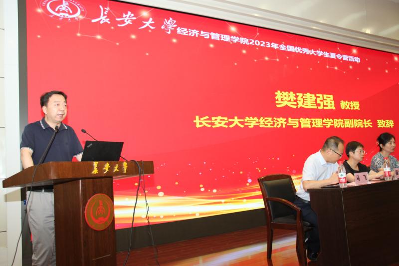 接着,我院副院长樊建强教授致辞。樊院长代表学院全体师生,对来自全国各地脱颖而出的203名优秀学子表示热烈欢迎,并简单介绍我院的硕博士点、一流专业、学科特色等基本情况,以及夏令营各活动环节的基本情况,希望同学们在夏令营上充分展现自己,同时欢迎来自全国各地的优秀大学生到长安大学经管学院攻读硕士研究生学位,为经管学院注入新生力量。