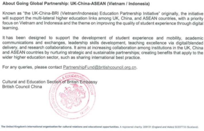 UK-China-BRI (Vietnam/Indonesia) Education Partnership Initiative国际联合项目的重点是通过数字化学习提高学生体验质量。种子基金将来自英国文化教育协会(British Council)提供的65,000英镑,用于与中国和越南,印度尼西亚合作,以加强在线教学和学习,改善学生体验,促进教育国际化。 基金由英国文化委员会提供和管理,由英国文化委员会中国代表、教育部、英国和中国的个别部门代表和领袖组成的项目委员会做出资助决定。获得资助的项目于2021年4月启动,最长可运行5年。