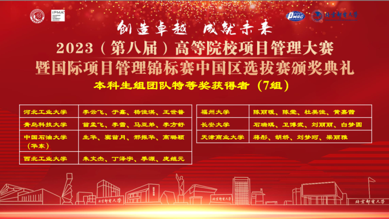 第八届高等院校项目管理大赛暨国际项目管理锦标赛中国赛区选拔赛于2023年5月28日在线上举行,已圆满落幕。本次大赛共有来自清华大学、北京大学、西北工业大学、中国石油大学、长安大学、北京邮电大学等全国各地92所高校的206支代表队,共1063名学生参加。