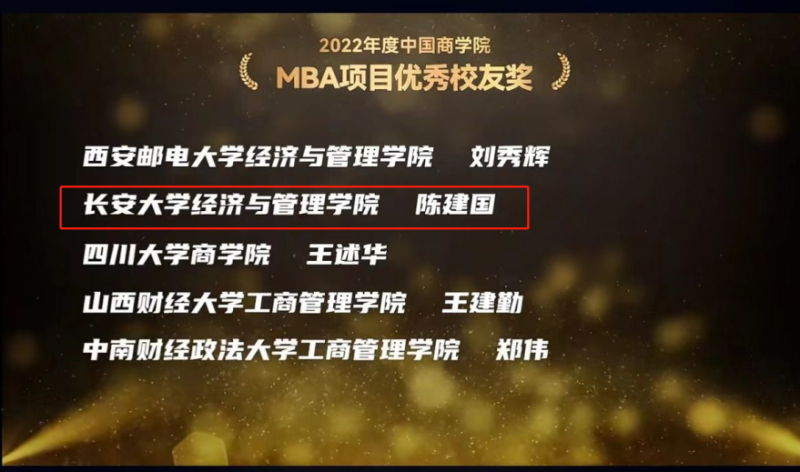 我院凭借前瞻务实的培养模式、扎实优良的教学质量,经过多环节、多维度的层层评选下,最终荣获”2022年度中国商学院最佳MBA项目TOP100”,MBA校友陈建国获“2022年度中国商学院MBA项目优秀校友奖”。