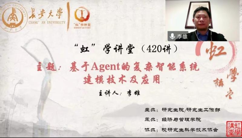 1月13日下午,由研究生院/研究生工作部主办、经济与管理学院承办、校研究生科学技术协会协办的“虹”学讲堂第420讲,以线上讲座形式顺利举办。中山大学李雄教授作了题为“基于Agent的复杂智能系统建模技术及应用”的报告,经管学院马飞教授主持,相关学院共300余名师生参加。