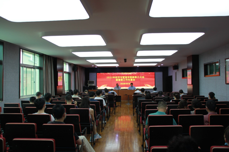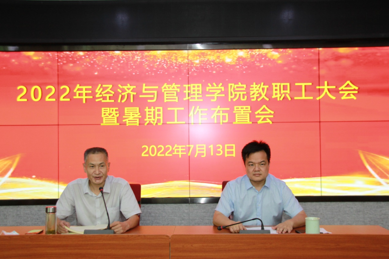 2022年7月13日下午,经济与管理学院召开2022年全院教职工大会暨暑期工作布置会。按照防疫工作要求,学院党政领导、各系室主任、学科建设责任教授、专业建设责任教授、行政管理人员线下参加会议,其他教职工线上参会。会议由学院党委书记魏一虎主持。
