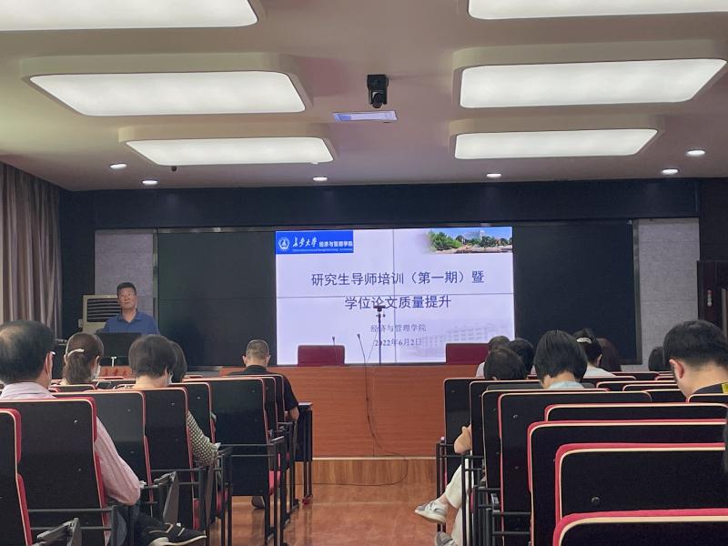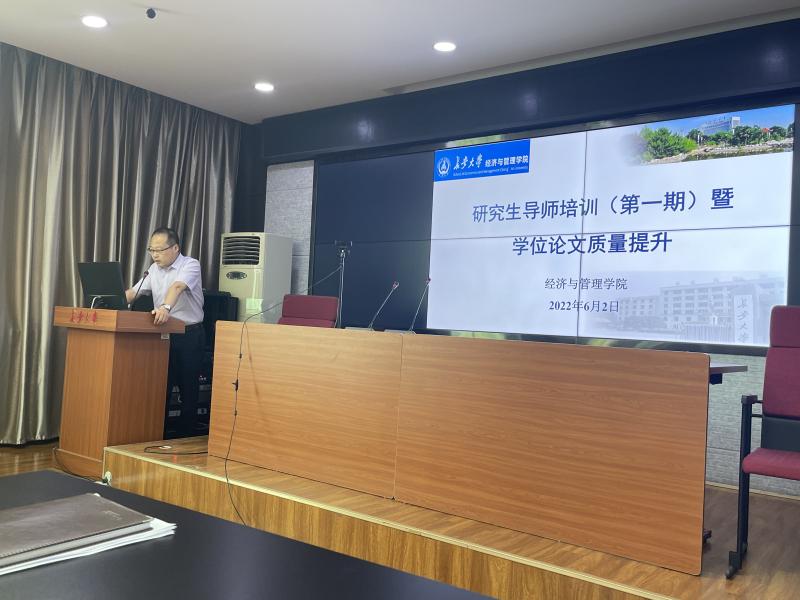 2022年6月2日下午,为全面提升研究生学位论文质量,学院在四楼会议室召开导师培训会暨学位论文质量提升会议。学院书记魏一虎、副书记张建斌、副院长马飞及50余名研究生导师参加了本次会议,会议由副院长马飞主持。