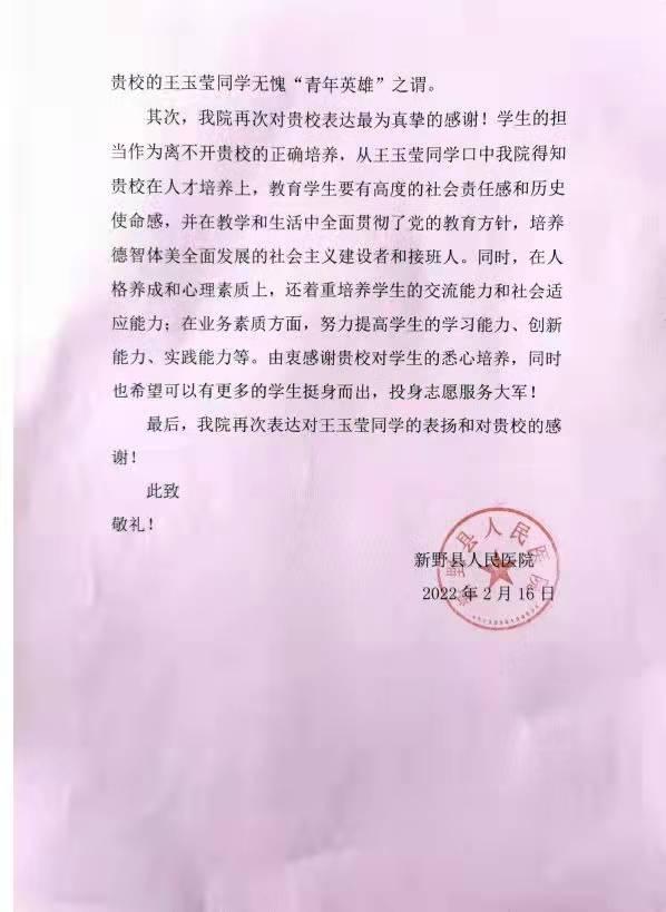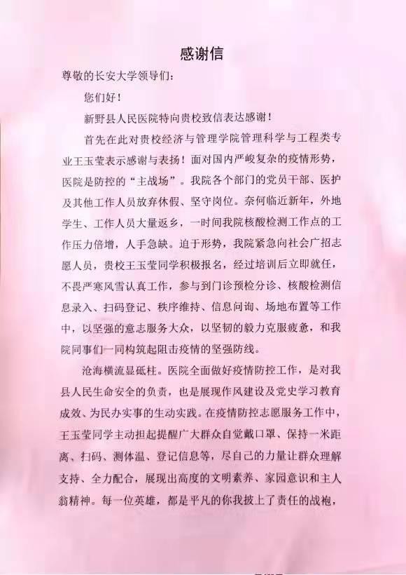2022年寒假期间,身处河南南阳新野县的我院2021级管理科学与工程类本科生王玉莹同学,积极响应当地号召,勇敢逆行,毅然投身抗疫一线,成为新野县人民医院的一名防疫志愿者,她不畏辛劳、不惧严寒,以饱满的热情出色地完成了各项任务,受到了医院医护工作人员和社区居民的一致肯定。