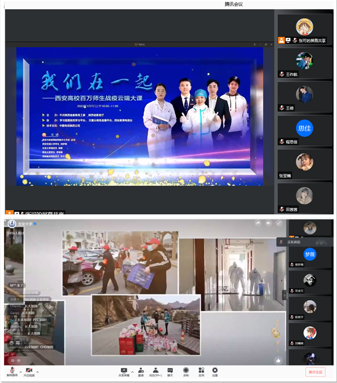 为进一步凝聚高校师生力量,坚定战疫必胜信心,教育引导广大师生自觉弘扬伟大抗疫精神,在疫情防控阻击战的生动实践中践行“请党放心,强国有我”的铮铮誓言,省委教育工委、省教育厅决定举办“我们在一起——西安高校百万师生战疫云端大课”活动。在学校的号召下,1月7日上午10:00-11:00,我院组织全体辅导员、1940余名本硕学生在线参加了课程学习,并展开热议: