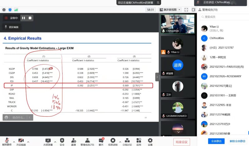 Journal Article Writing and Publishing(Part I、II)讲座过程中,Kim Chi-Yeol教授分别从英文期刊论文写作相关的研究热点选题、论文研究框架设计、投稿期刊选择等为例进行了整体介绍,并以具体论文为例对相关内容进行了详细演示和讲解,包括论文的背景介绍、数据收集、实证分析、总结与建议等方面。最后,同学们与Kim Chi-Yeol教授进行了积极的互动,Kim Chi-Yeol教授耐心回答同学们的提问并对同学们感兴趣的内容给予详细指导和建议。