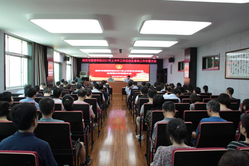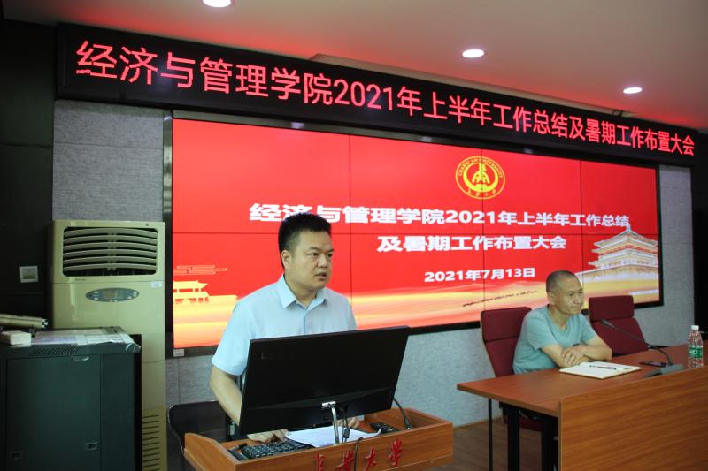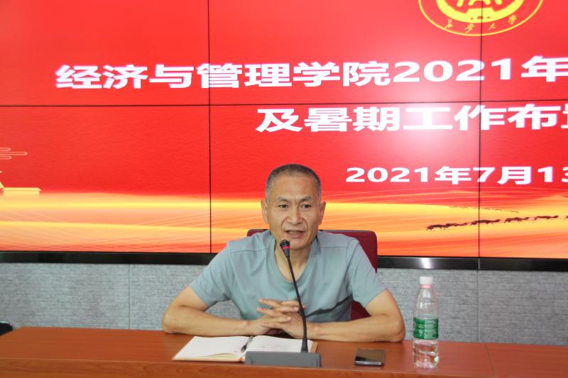 2021年7月13日上午,经济与管理学院2021年上半年工作总结及暑期工作布置大会在四楼会议室举行,学院全体教职工参加会议,会议由学院党委书记魏一虎主持。
