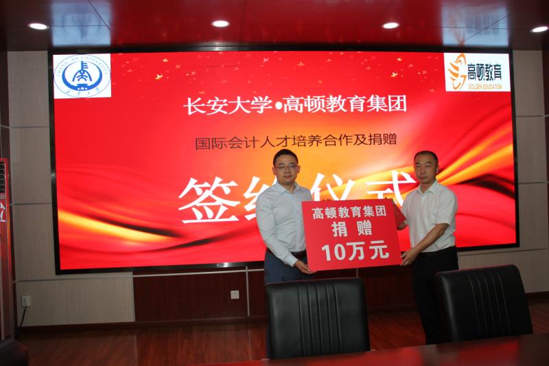 6月28日下午,高顿教育集团与我院签署国际会计人才培养及合作协议,并为我院捐赠10万元用于学院学科建设及人才培养,捐赠仪式在我院一楼会议室举办。高顿教育集团高校事业部总经理舒畅一行六人、长安大学社会合作处副处长邱旭辉、我院院长杜强、副院长孙启鹏、党委副书记李宏伟及部分教师代表出席了捐赠仪式。