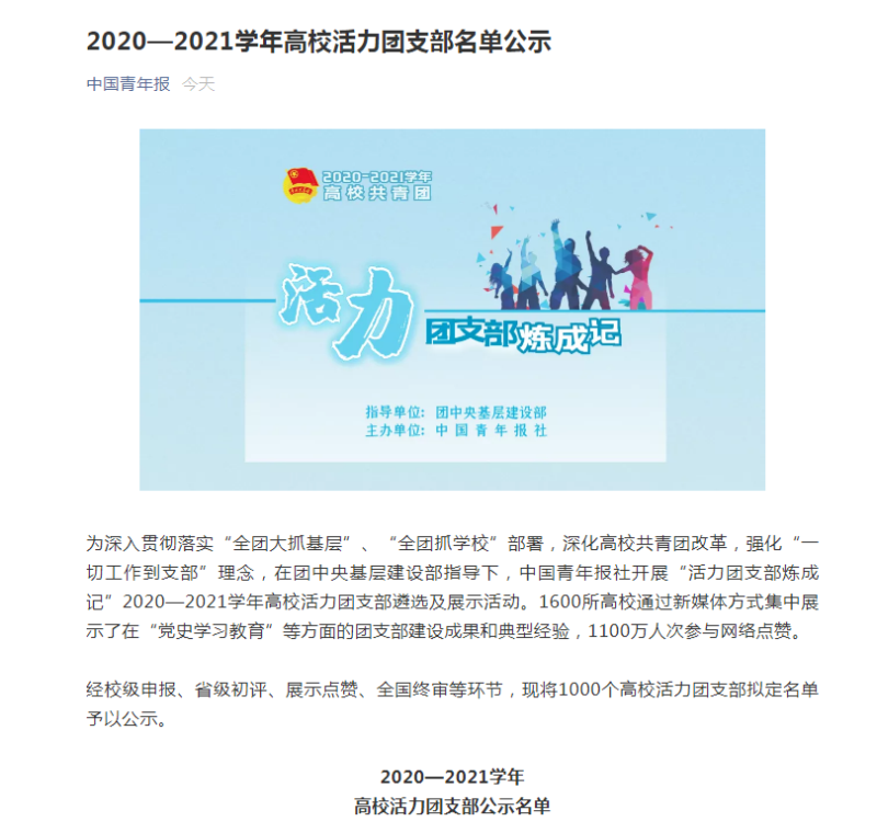 由团中央基层建设部指导,中国青年报社主办的“2020-2021学年高校活力团支部遴选及展示活动”已进入公示阶段,经校级申报、省级初评、展示点赞和全国终审等环节,我院2017级信息管理与信息系统团支部获评2020-2021学年高校活力团支部。
