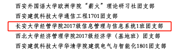 长安大学经济与管理学院2017级信息管理与信息系统团支部成立于2018年,共有42名成员。2020年5月入选“全省高校团建样板支部”培育创建名单;2020年11月荣获“长安大学卓越奖·班级引领之星”“长安大学文明班集体”;其中一人的团队获得2020年“长安大学标兵奖·长大之星(团队)”。