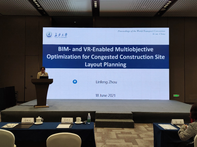 徐晟老师主持“智慧施工与风险管控论坛”并作《国内外道路基础设施数字化标准及相关政策比较对接》的主题演讲,韩言虎老师在“城市交通需求与空间管理论坛”上作《Study on the identification and evolution of the hinterland of national central city based on land transportation accessibility——taking Xi’an as an example》的主题演讲,管理科学与工程20级硕士生周琳风在“智慧施工与风险管控论坛”上作《BIM- and VR-Enabled Multiobjective Optimization for Congested Construction Site Layout Planning》的主题演讲。