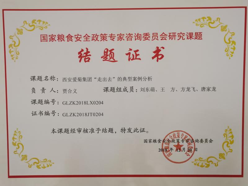 国家粮食安全政策专家咨询委员会研究课题结题证书