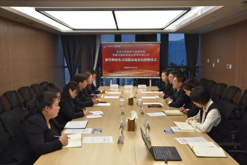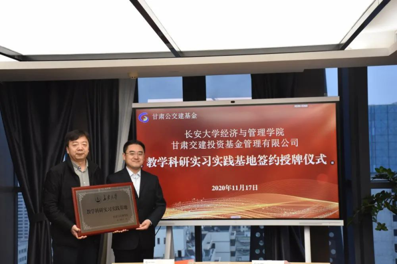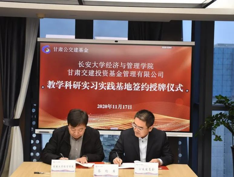 2020年11月17日,长安大学经济与管理学院与甘肃交建投资基金管理有限公司共建教学科研实习实践基地签约授牌仪式在甘肃交建基金公司举行。我院副院长樊建强教授、基金公司总经理景宏福代表双方签署协议。
