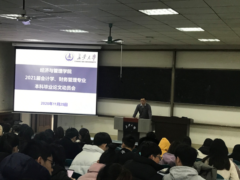 2020年11月25日上午,财务会计系在渭水校区WT1202教室,召开了2021届会计学专业和财务管理专业本科毕业论文动员会。动员会由财务会计系李辽宁老师主持。李老师向在场的150多名大四毕业班学生介绍了学校有关毕业论文的基本要求、规章制度、时间安排、撰写规范等内容,并通过举例的形式详细讲解了有关选题范围、研究思路、研究方法等内容,耐心回答了学生提出的有关问题,使学生对毕业论文的重要意义、工作安排以及具体要求,有了相对全面的理解和认识。此次动员会为财务会计系师生顺利、高效地开展毕业论文撰写和指导工作奠定了良好的基础,充分发挥了动员会在保障本科毕业论文质量方面的重要作用。