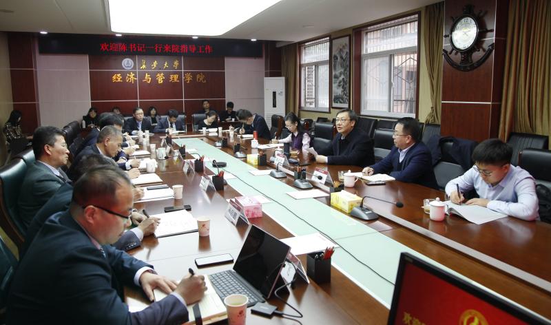 陈志坚书记对经管学院的工作及取得的成绩给予了充分的肯定,对学院未来发展思路和措施表示高度认可,认为学院领导班子是团结凝聚的班子,学院教职工是对事业高度负责的集体。陈书记表示,经管学院要坚持以学科建设为龙头、以人才培养为根本、以师资建设为抓手,找准发展短板,分析问题成因,明确改进方向,聚力创新发展,努力创建聚焦主流、方向凝聚、特色发展的高水平学院。