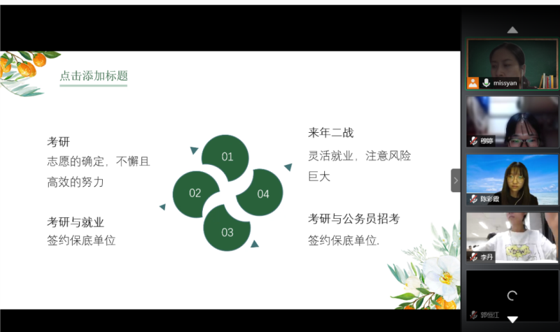晏主任根据大四学生的未来去向分别提出了建议,考研的同学需尽早明确考研志愿、提早着手准备;拟就业的同学,鼓励大家准确定位,积极应聘;公务员考试竞争激烈,建议大家做好充分的准备,了解岗位,根据自己情况选择区域和单位,有所取舍。接下来,晏主任就择业观、面试技巧、面试准备等方面与同学进行深入交流。此外,统计系专任老师也就择业就业的相关问题对学生提出建议。