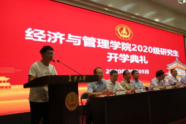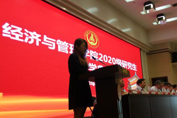 接着,2019级会计学研究生卞井春、2018级工程管理硕士研究生张朦作为在校研究生代表发言,他们从自身经历出发,激励全体新生不甘平凡、突破自我、获得成就。2020级管理科学与工程研究生李雅娴、2020级MBA硕士研究生蔡智慧作为新生代表发言,展示出新生面对崭新的研究生生活的信心和不忘初心、砥砺前行的决心。