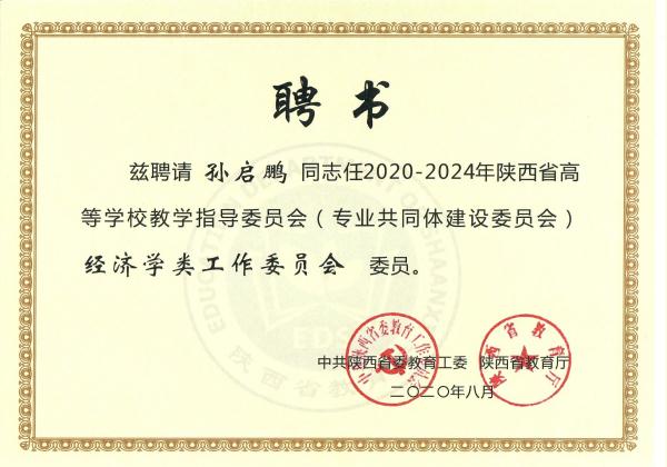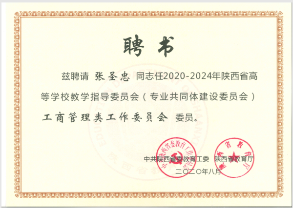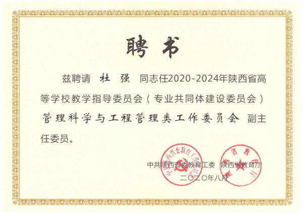 7月23日,陕西省教育厅、中共陕西省委教育工委联合发布了《关于成立2020-2024年陕西省高等学校教学指导委员会(专业共同体建设委员会)的通知》(陕教工﹝2020﹞158号)。我院杜强教授被聘任为管理科学与工程管理类工作委员会副主任委员,孙启鹏教授被聘任为经济学类工作委员会委员,张圣忠教授被聘任为工商管理类工作委员会委员。