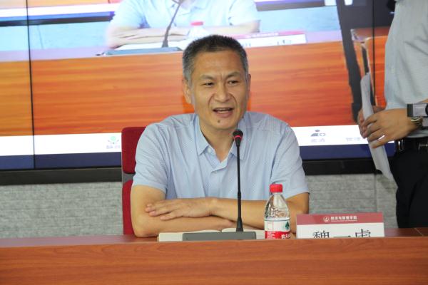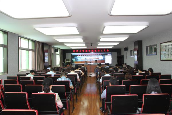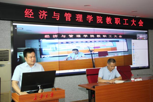 2020年7月15日下午,经济与管理学院全体教职工大会线上、线下同步举行,学院全体教职工参加会议,会议由院党委书记魏一虎主持。