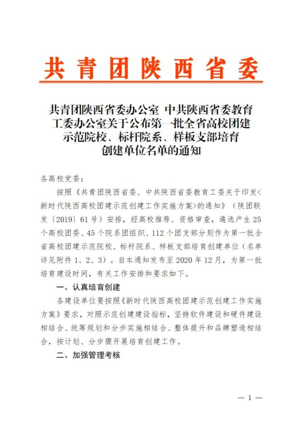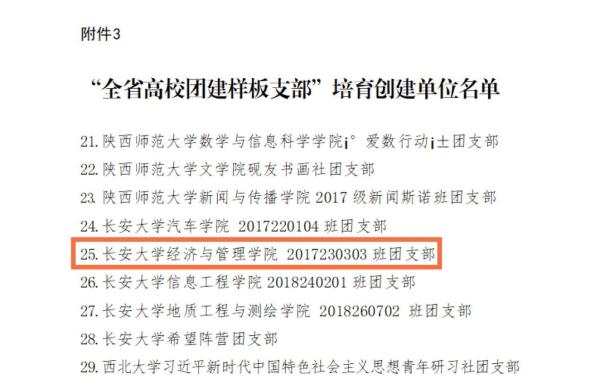 近日,共青团陕西省委、中共陕西省委教育工委公布的第一批全省高校团建示范院校、标杆院系和样板支部培育创建名单,我院2017230303班团支部入选“全省高校团建样板支部”培育创建单位,这是我院基层团支部建设工作取得的又一佳绩。