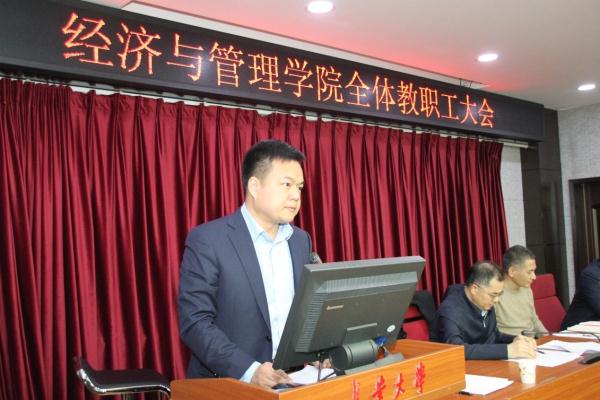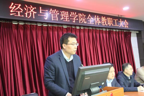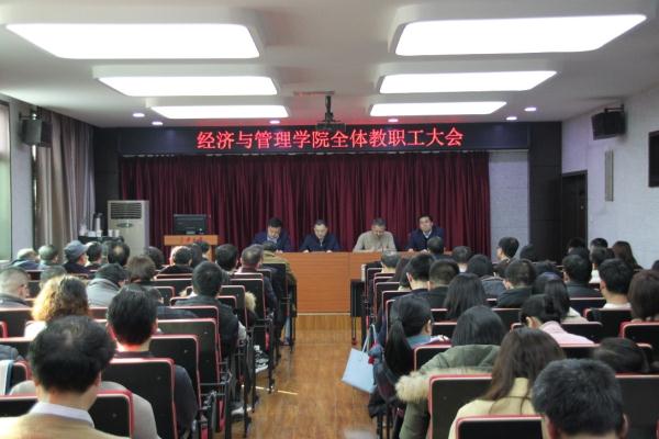1月11日下午,经济与管理学院全体教职工大会在学院四楼多功能培训室举行。副校长赵祥模、组织部部长李文雄、纪委副书记吴永红出席大会,学院全体教职工参加会议,会议由院党委书记魏一虎主持。