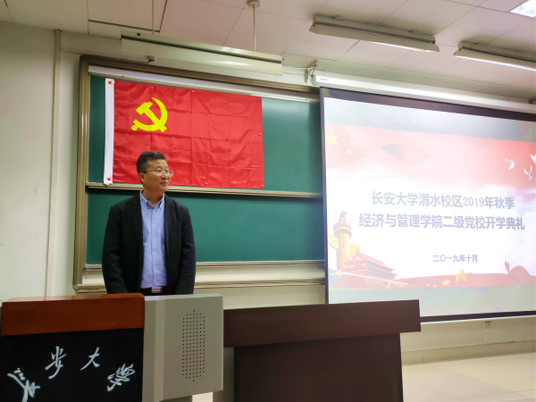10月21日晚七点,经济与管理学院二级党校在WM1301教室举行2019年秋季开学典礼,长安大学党校办公室主任王金会、经济与管理学院党委书记魏一虎、党委副书记张建斌、党委副书记吴喜梅出席开学典礼,学办主任陈向涛、二级党校班主任陈宏进及培训班全体学员参加本次典礼。典礼由院党委副书记张建斌主持。