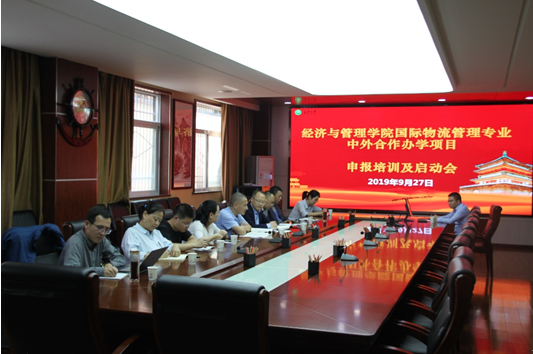9月27日下午,经济与管理学院国际物流管理专业中外合作办学项目申报培训及启动会在学院一楼会议室召开。会议邀请国际处罗涛老师就国际物流管理专业中外合作办学项目申报作专题培训,学院党委书记魏一虎、院长助理马飞、物流系主任马暕及物流系骨干教师代表参加会议。会议由院长助理马飞主持。