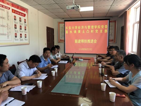 经管学院一行来到党建结对帮扶村——黄土凸村,在村党群服务中心党员活动室与黄土凸村党支部对接,对接工作以座谈会的形式展开,商南县县域工业集中区管委会主任林贵宾、商南县富水镇党委书记田培训详细介绍了富水镇及黄土凸村脱贫攻坚工作情况以及今年面临的任务、具体困难和需求。在了解了黄土凸村的具体情况后,经管学院党委书记魏一虎表示,学院党委将立足学院专业人才、学科优势,利用学院的智力资源、科研平台,结合当地地理、产品、生态以及党建对接优势,尽学院最大的努力找到促进地方经济发展的方案,希望以此党建结对工作为契机,彼此坦诚交流,找到切实可行的合作切入点,打好扶贫攻坚战。