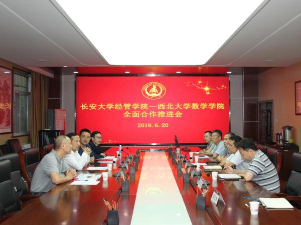 6月20日,长安大学经济与管理学院——西北大学数学学院合作推进会在学院一楼会议室举行。西北大学数学学院院长郭真华、应用统计教研室主任夏志明、金融数学教研室主任勾明、副教授王冬岭一行4人出席会议,我院院长袁长伟、党委书记魏一虎、副书记张建斌、副院长樊建强等参加会议。袁长伟院长主持会议。