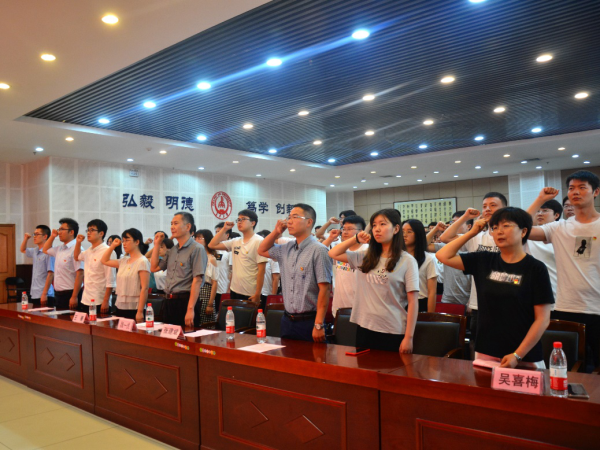 宣誓仪式在《国际歌》声中拉开帷幕。院党委副书记张建斌领誓,58名新加入党组织的预备党员和师生党员代表一起,面向党旗,紧握右拳,庄严宣誓。