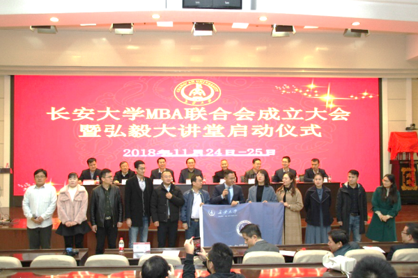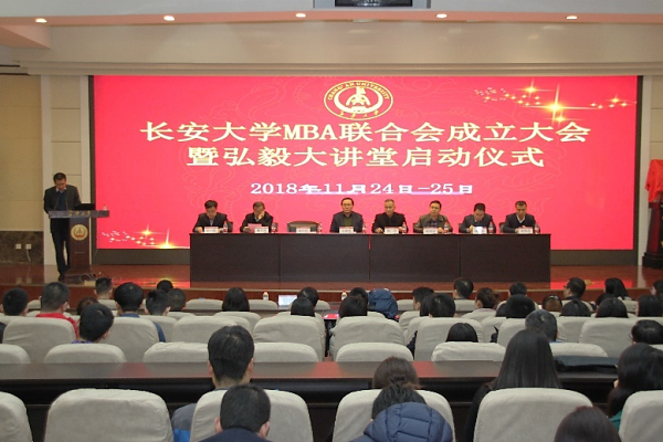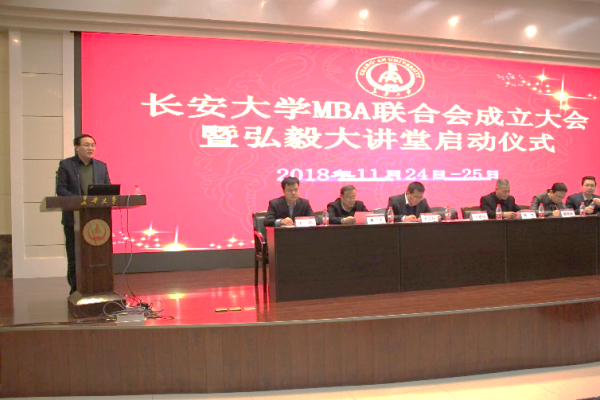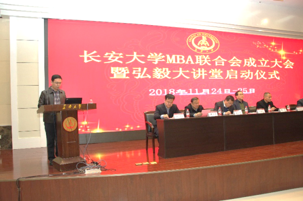 11月24日,长安大学首届MBA联合会成立大会暨“弘毅”大讲堂启动仪式在学术交流中心一楼报告厅举行,标志着学校MBA管理水平再上一个新台阶。长安大学副校长王建伟,研究生院副院长柳有权,团委副书记姬国斌,经济与管理学院院长袁长伟、院党委书记魏一虎,MBA教育中心副主任樊根耀,博士生导师董千里、中交高新科技产业发展有限公司总经理赵杨东等出席成立仪式,仪式由杜强副院长主持。二百余名MBA、MEM学员参加了仪式。