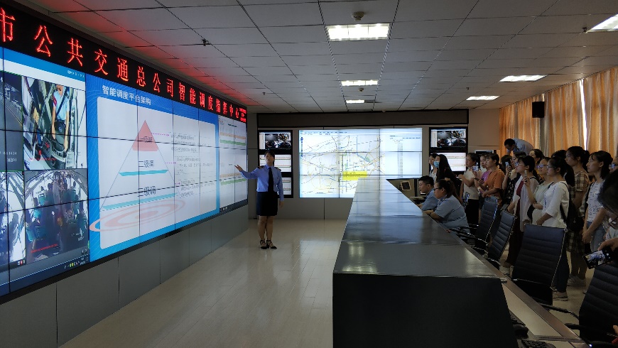 西安市公共交通总公司的解说员为学生讲解了公司的组织架构、发展历史等基本信息,然后带学生参观了965315热线服务中心,最后参观了智能调度指挥中心,并讲解了该中心是如何利用大数据综合分析和实时查看各站点的运行情况,并实行科学调度。