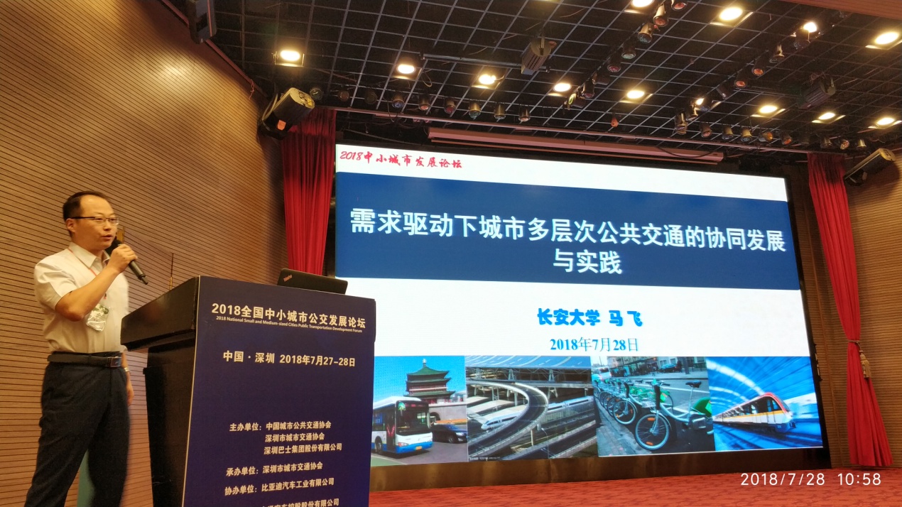2018年7月27日至28日,由中国城市公共交通协会、深圳市城市交通协会和深圳巴士集团联合主办的“2018全国中小城市公交发展论坛暨深圳国际公共交通装备与技术展览会”在深圳会展中心成功举办,来自全国各地的100多家单位,300余位政府相关部门负责人、公交企业负责人和专家学者参加论坛。我院马飞副教授应邀作了《需求驱动下城市多层次公共交通的协同发展与实践》主题演讲。