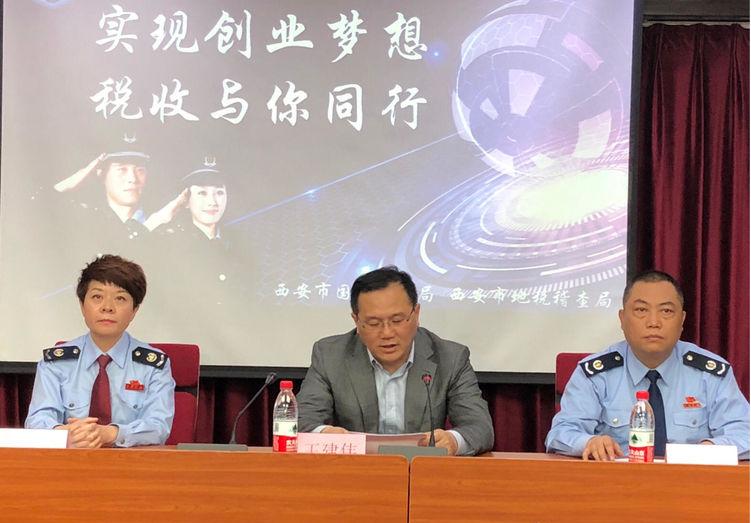 2018年4月11日下午,西安市国税稽查局党组书记、局长赵亚龙,西安市地税稽查局副局长徐朝霞等领导干部十余人一行,来到长安大学,在经管学院四楼多媒体教室举行了“实现创业梦想 税收与你同行”主题宣讲活动。长安大学党委常委、副校长王建伟出席活动并讲话。我校二百余名师生参加。