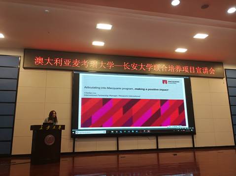 2018年3月24日上午,在长安大学渭水校区报告厅,澳大利亚麦考瑞大学-长安大学联合培养项目宣讲会顺利举行。麦考瑞大学国际处联络经理Cherilyn Liu女士对国际经济与贸易专业学生的“2+2”双学士联合培养及会计(CPA)“3+2” 本硕连读项目进行了详细介绍。可容纳400人的大礼堂座无虚席,会后逾20名学生参加了该项目的笔试及面试,表现优异。宣讲会由院长助理马飞主持,国际经济与贸易主任李丽教授、财务会计系主任云虹教授和郭慧婷老师参加宣讲会,并组织了会后的笔试和面试工作。