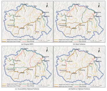 该研究提出了一种兼顾网络可达性与空间溢出效应的农村公路网络优化方法,旨在为乡村振兴战略提供科学的道路规划依据。论文以行政村为最小单元,采用时变空间权重矩阵表征农村公路网络,构建空间计量经济模型并进行参数估计,在此基础上将实证结果嵌入优化目标函数,形成同时考虑可达性与空间溢出效应的双目标优化模型,并采用NSGA-Ⅱ算法进行求解。研究结果表明,农村公路网络同时存在正向与负向的空间溢出效应,若在优化过程中忽视空间溢出效应,可能削弱农村经济活力并阻碍城乡融合发展。此外,研究发现与静态空间权重矩阵相比,时变空间权重矩阵能够更为准确地刻画农村公路网络的空间溢出效应。这一成果为优化农村公路网络设计、促进城乡经济协调发展提供了有益的方法论借鉴与实践参考。