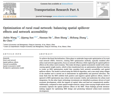 近日,我院孙启鹏教授课题组在交通运输科学领域顶级期刊《Transportation Research Part A: Policy and Practice》上发表了题为《Optimization of rural road network: balancing spatial spillover effects and network accessibility》的研究论文。孙启鹏教授为论文通信作者,其博士生王佳彬为第一作者,长安大学为第一作者单位。