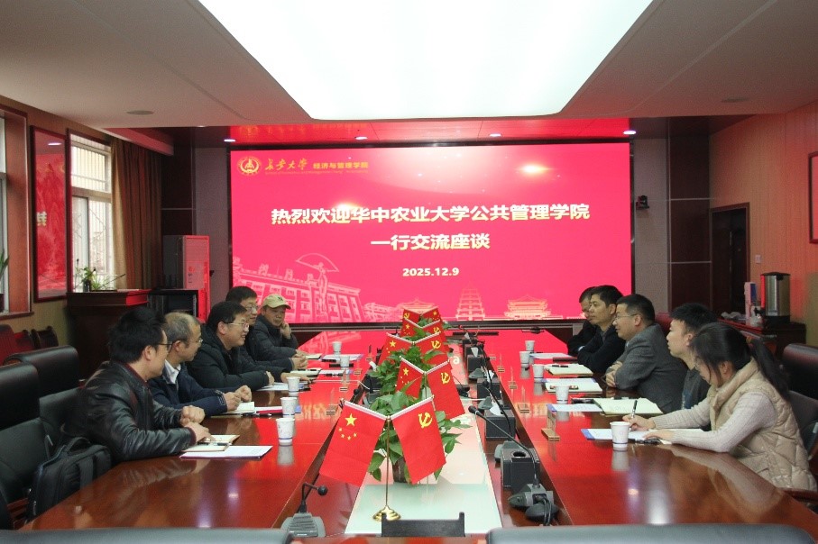 12月9日下午,华中农业大学公共管理学院党委书记周向阳、副院长汪文雄等一行4人来访长安大学经济与管理学院,双方在学院107会议室举行调研座谈会。会议由学院副院长白礼彪主持,学院实验室中心主任李永平和管工系的教师代表参加座谈会。
