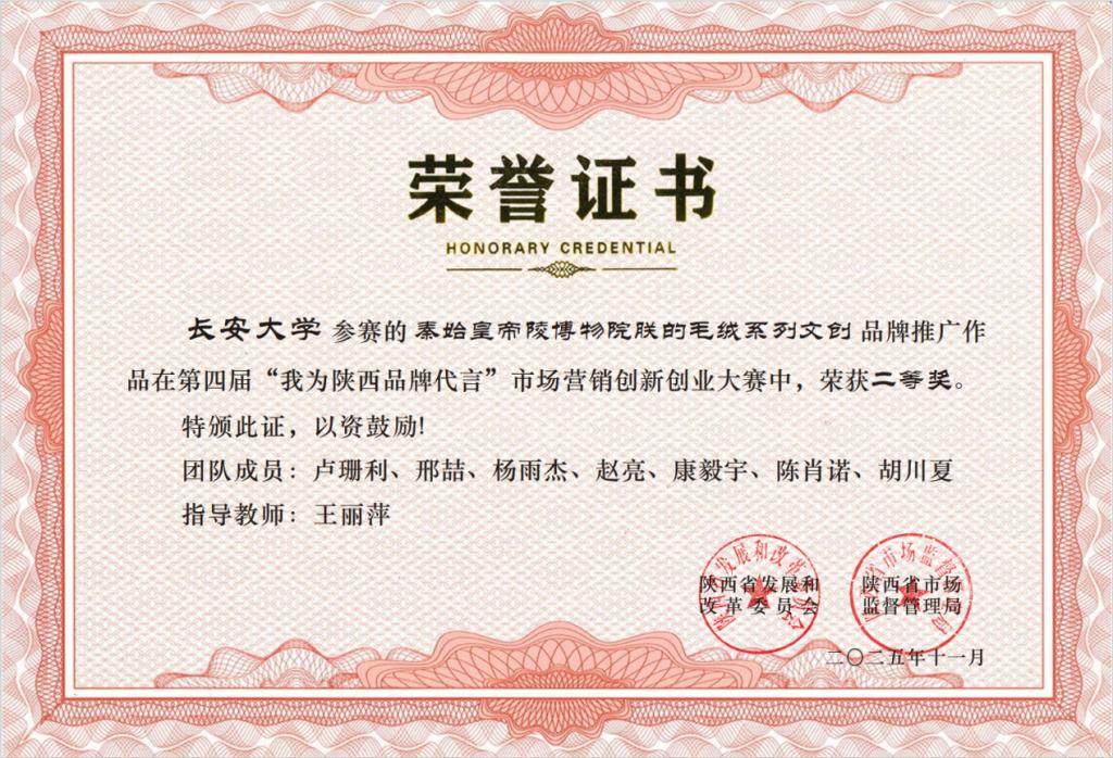 本届大赛由陕西省发改委主办,西安理工大学品牌和高质量发展研究中心承办,以“传承三秦古韵,智领文创未来”为主题。大赛自2025年4月启动以来,共吸引了西北农林科技大学、西安电子科技大学、长安大学等全省30多所高校积极响应,累计300多支队伍、3000多名学生踊跃参与。经过多轮选拔,我院王丽萍老师指导的《秦始皇帝陵博物院朕的毛绒系列文创》品牌推广作品获得二等奖,马飞老师指导的《陕历博唐代仕女俑超活化唐代仕女办公日常盲盒》品牌推广作品获得优秀奖。