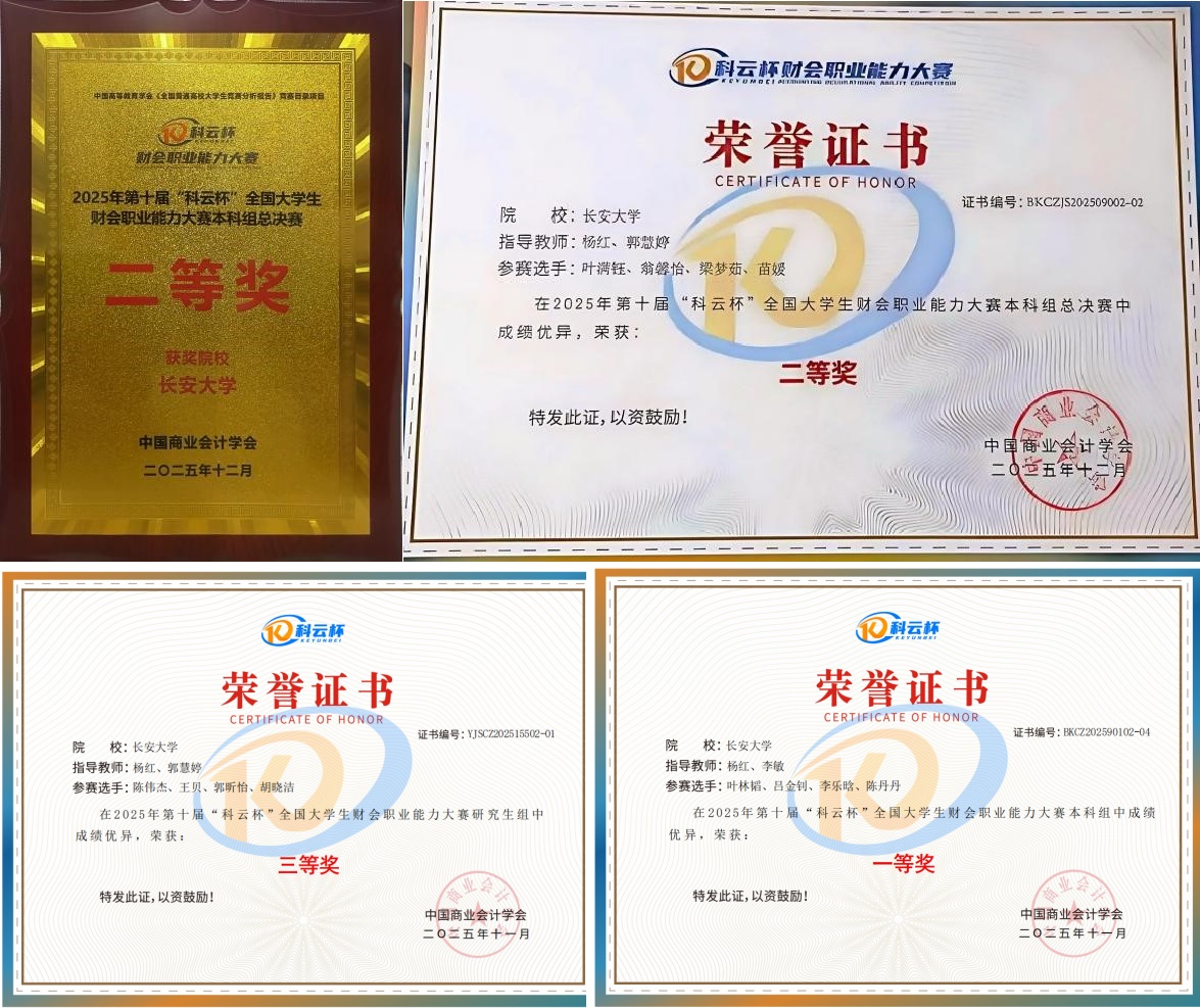 12月底,第十届“科云杯”全国大学生财会职业能力大赛本科组全国总决赛圆满落幕。我院会计学专业2023级本科生叶满钰、苗媛、梁梦茹、翁馨怡组成的长安大学代表队,从全国各省市选拔的120支决赛队伍中脱颖而出,荣获本科组全国二等奖,指导教师杨红、郭慧婷获评“优秀指导教师”。在之前举行的首届研究生组全国总决赛中,我院研究生陈伟杰、王贝、郭昕怡、胡晓洁组成的长安大学代表队,荣获研究生组全国三等奖。