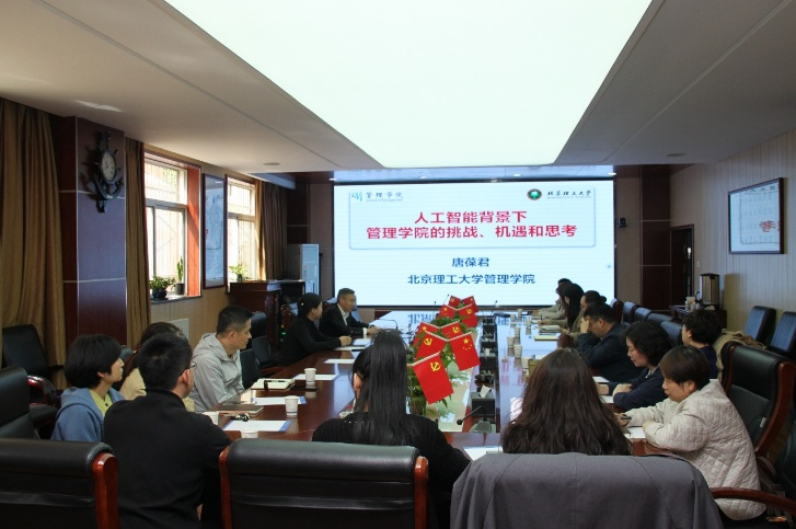 唐葆君教授介绍了北京理工大学管理学院的发展历程和在学科建设、科研平台、教学改革、人才培养及国际化办学等方面的经验,重点分享了AI赋能下的科研、教学平台搭建实践以及中外高水平在线课程及学术活动品牌建设探索。双方就人工智能背景下管理学院的发展模式进行了充分交流与探讨。