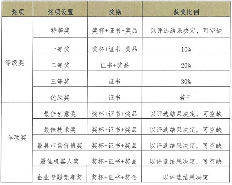 全国竞赛设立等级奖、单项奖和优秀组织奖。等级奖中设立一等奖、二等奖和三等奖若干项,分别约占参赛项目总数的10%、20%和30%,设特等奖,根据决赛评选结果确定特等奖作品,可空缺。同时根据参赛作品设立单项奖(最佳创意奖、最佳技术奖、最具市场价值奖、最佳机器人奖,可空缺);企业专题竞赛设企业专题竞赛奖,由企业及竞赛评审专家共同确定获奖作品。对参赛高校设立优秀组织奖设若干项,比例控制在参赛高校数量的20%以内。